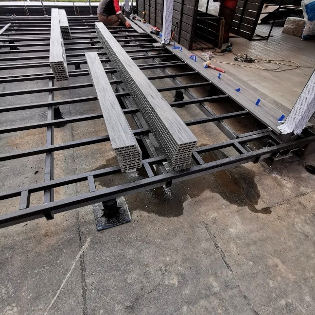 Пока декинг будет адаптироваться к новым условиям, подготовьте к работам настил. Используйте для этого цементную стяжку с гидроизоляцией из битума.